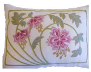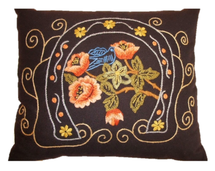 Tässä tyynyssä on kaunis kukkakuvio hevosenkengän sisällä. Siinä on herkkää kauneutta ja romanttista tunnelmaa. Jokainen yksityiskohta on harkittu huolella, jotta tyynystä tulee paitsi silmiähivelevän kaunis myös pitkäikäinen.